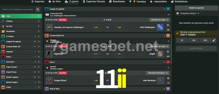 O 11ii oferece uma grande seleção de opções de apostas em e-sports com probabilidades competitivas